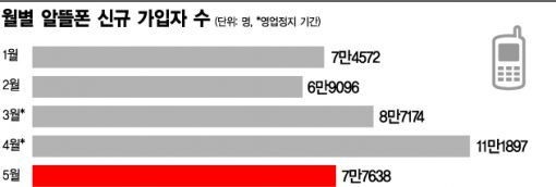 ÇÑÆí Çѱ¹Åë½Å»ç¾÷ÀÚ¿¬ÇÕȸ(KTOA)¿¡ µû¸£¸é Áö³ 5¿ù ¾Ë¶ãÆù °¡ÀÔÀÚ ¼øÁõÀº ÃÑ 7¸¸7638¸íÀ̾ú´Ù. ÀÌÅë3»çÀÇ ¿µ¾÷Á¤Áö°¡ ½ÃÀÛµÈ Áö³ 3¿ù 13ÀϺÎÅÍ Å©°Ô ´Ã±â ½ÃÀÛÇØ 4¿ù¿¡´Â ¿ª´ë ÃÖ°í ¼øÁõ ±â·ÏÀÎ 10¸¸¸íÀ» ±â·ÏÇÑ °ÍÀ» °¨¾ÈÇϸé 2¸¸¸í ÀÌ»ó ÁÙ¾îµç °ÍÀÌ´Ù. ¾Ë¶ãÆùÀÇ Àú·ÅÇÑ Åë½Å·áº¸´Ù º¸Á¶±ÝÀ¸·Î ´Ü¸»±â ºÎ´ãÀ» ÁÙÀÌ´Â ÂÊÀ¸·Î ¼ÒºñÀÚµéÀÌ ¸ô¸®°í ÀÖ´Ù´Â ºÐ¼®ÀÌ´Ù.